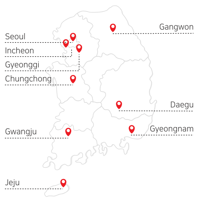 Busan(Buk-gu, Nam-gu, Dongrae), Gimhae, Changwon, Geoje, Ulsan, Daegu, Dongdaegu