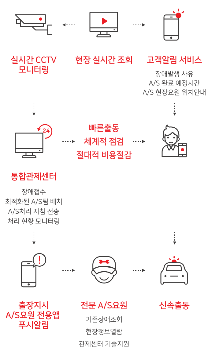 현장, 통합상황실, AS엔지니어가 실시간으로 정보를 공유하여 출동 시간을 최소화합니다.